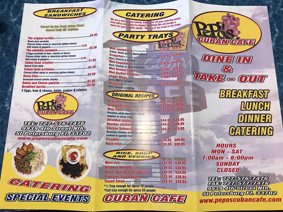 Welcome to Pepo's Cuban Cafe, the hidden gem of St. Petersburg where authenticity meets affordability. Located at 9939 4th St N, this vibrant spot is celebrated for its diverse menu that captures the essence of Cuban culinary tradition. Customers rave about the original Cuban sandwich, succulent pork, and delectable rice and beans—each dish a testament to the rich flavors of Cuba.