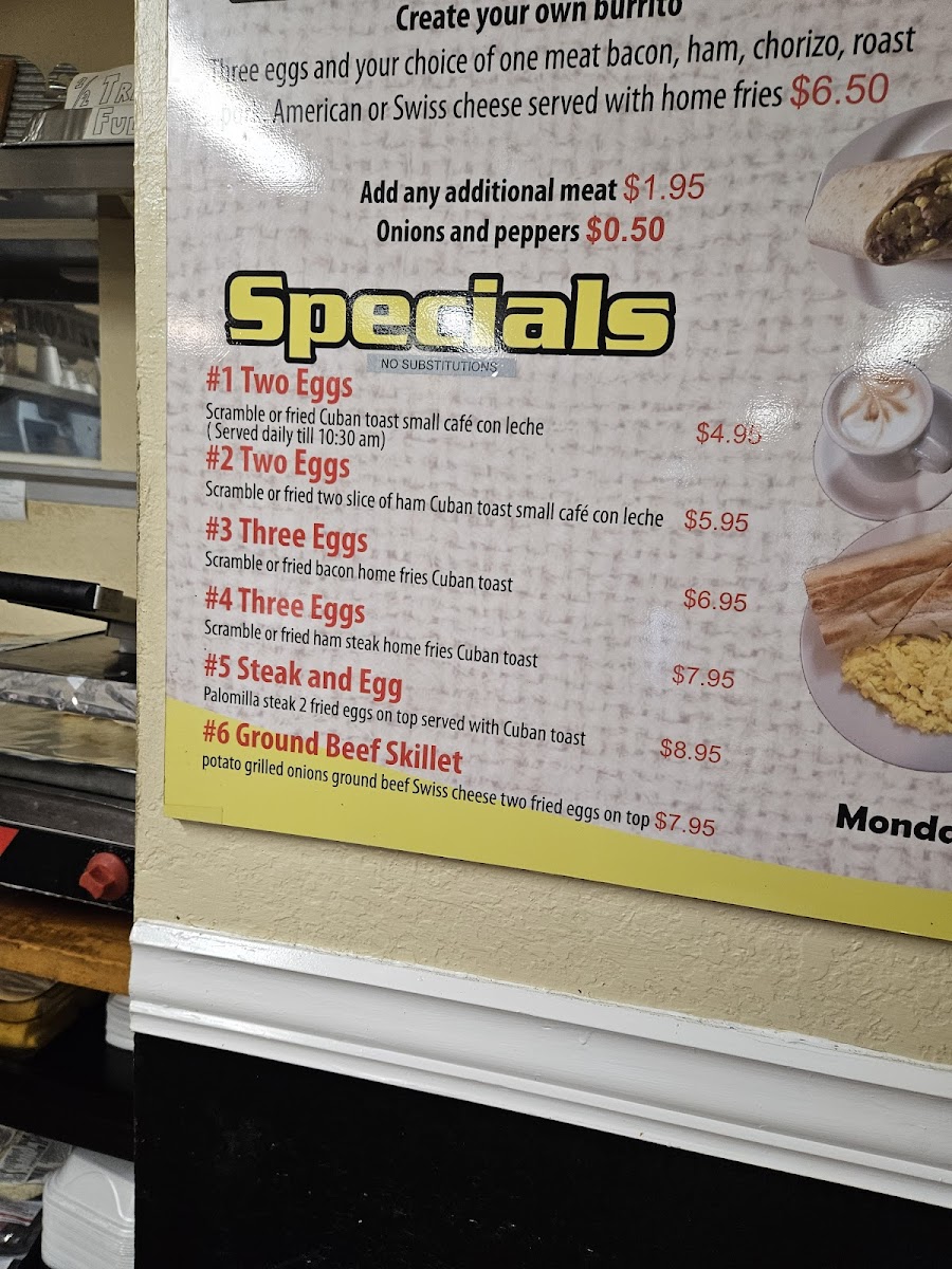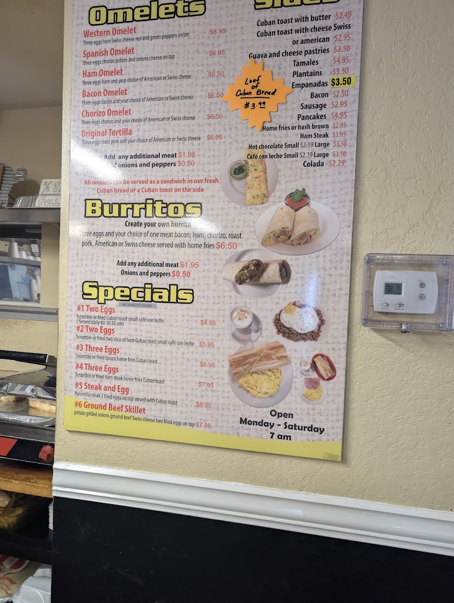 2 egg, 2 slices of ham, Cuban toast small cafe con Leche.
